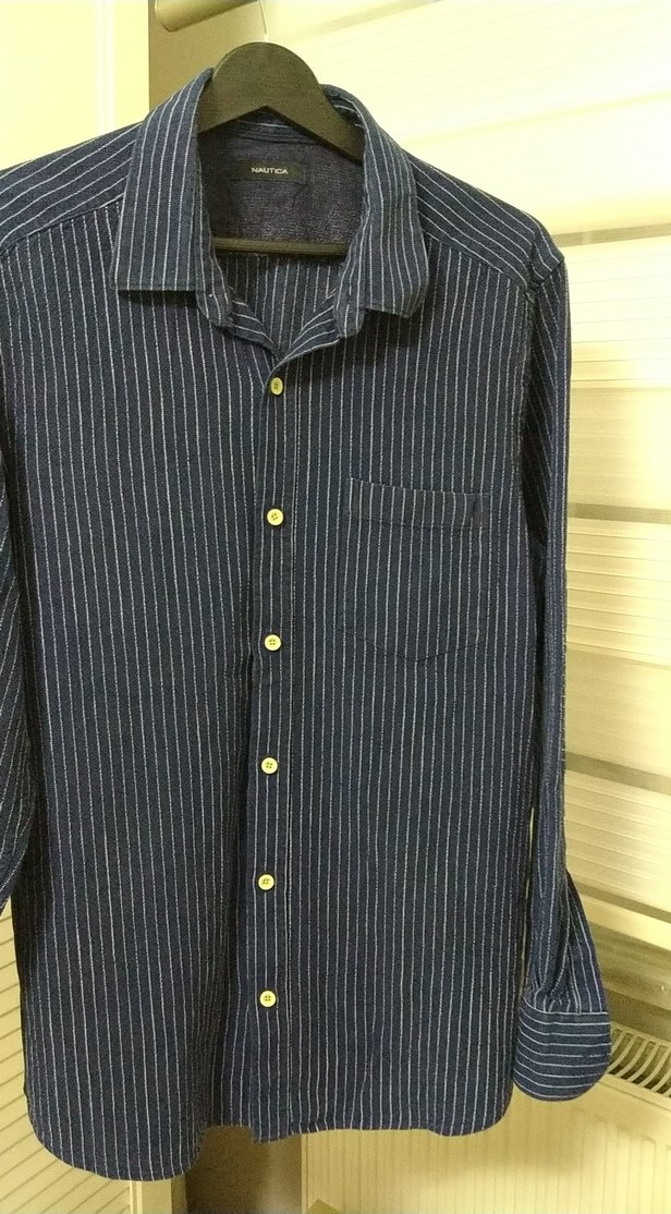 Uzun kollu, düğmeli ve yakası kesimli erkek lacivert denim gömlek. Gri ince çizgilerle desenlenmiş, normal kesim ve günlük ya da ofis kullanımı için uygun.
