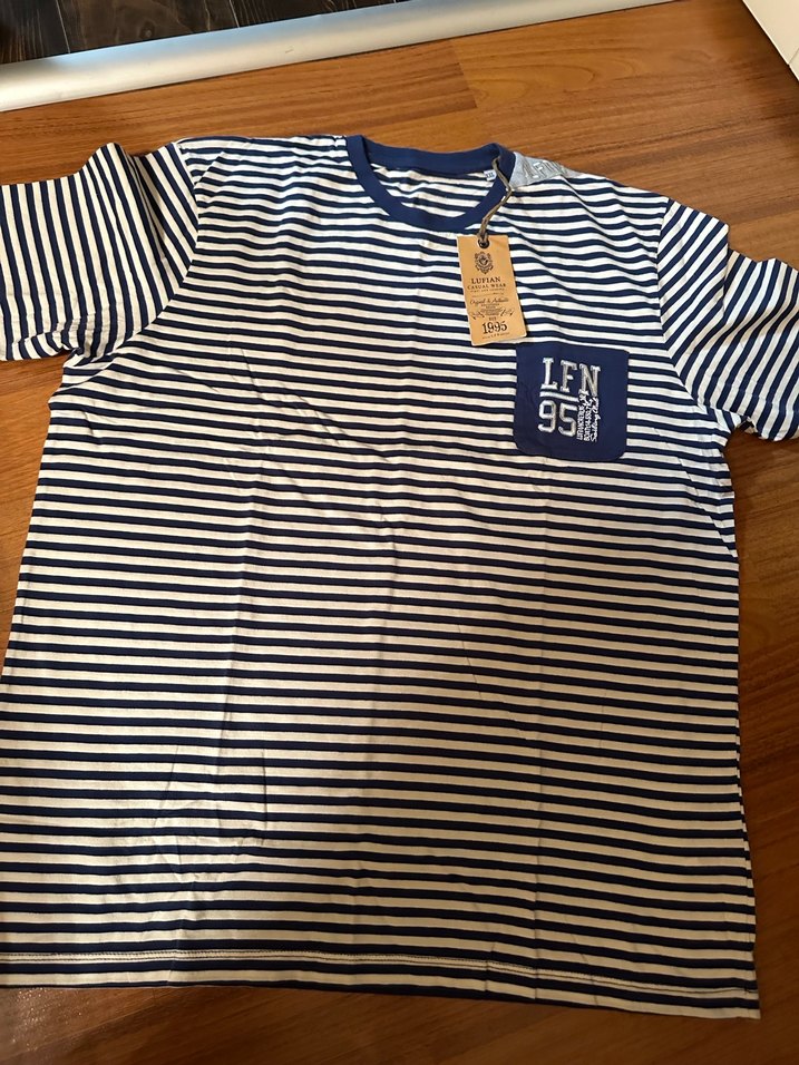 Erkekler için kısa kollu pamuklu tişört, bol kesim ve yuvarlak yaka. Çizgili desen ve düğmeli cep detayıyla günlük sokak stili için uygun.