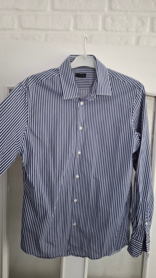 Erkek gömleği, regular fit kesim, uzun kollu ve yakalıdır. Düğmeli, lacivert çizgili desene sahip, ofis ve günlük kullanıma uygundur. Sentetik kumaştan üretilmiştir.