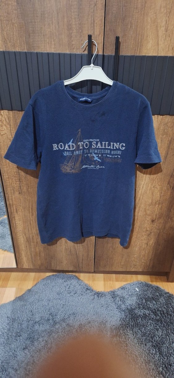 Erkek lacivert denim kısa kollu tişört, yuvarlak yakalı ve bol kesimdir. Kemer detaylı ve "ROAD TO SAILING" baskılıdır. Günlük sokak tarzı. ⚓
