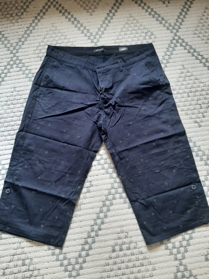 Lacivert renkli, düğmeli ön kısmı ve bol kesimiyle erkek bermuda şort. Desenli, günlük rahat sokak stili için uygun. paça boyu ayarlanabilir. 36 beden