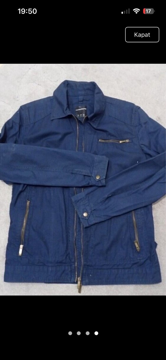 Erkek ceketi, parlak lacivert denim kumaş, kesik yaka ve fermuarlı ceplerle tasarlanmıştır. Uzun kollu, normal kesim ve günlük kullanıma uygundur.