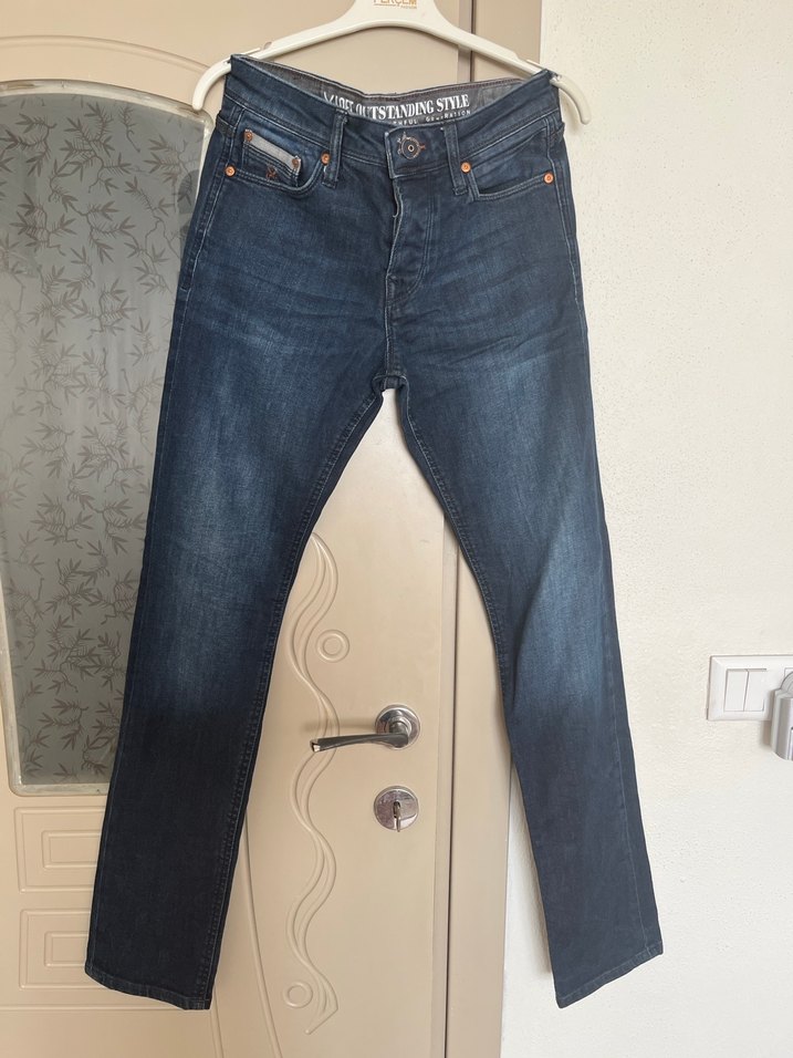 Erkekler için lacivert denim kot pantolon, düğmeli ve regular fit kesime sahiptir. Günlük ve sokak stiline uygun, normal boyda ve desensizdir.