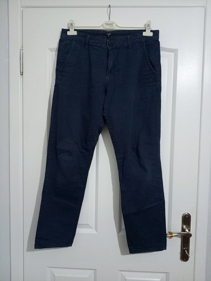 bel 43cm boy. 99cm Lacivert erkek denim pantolon, regular fit kesim ve düğmeli kapanışa sahip, günlük rahat sokak stili için uygundur.