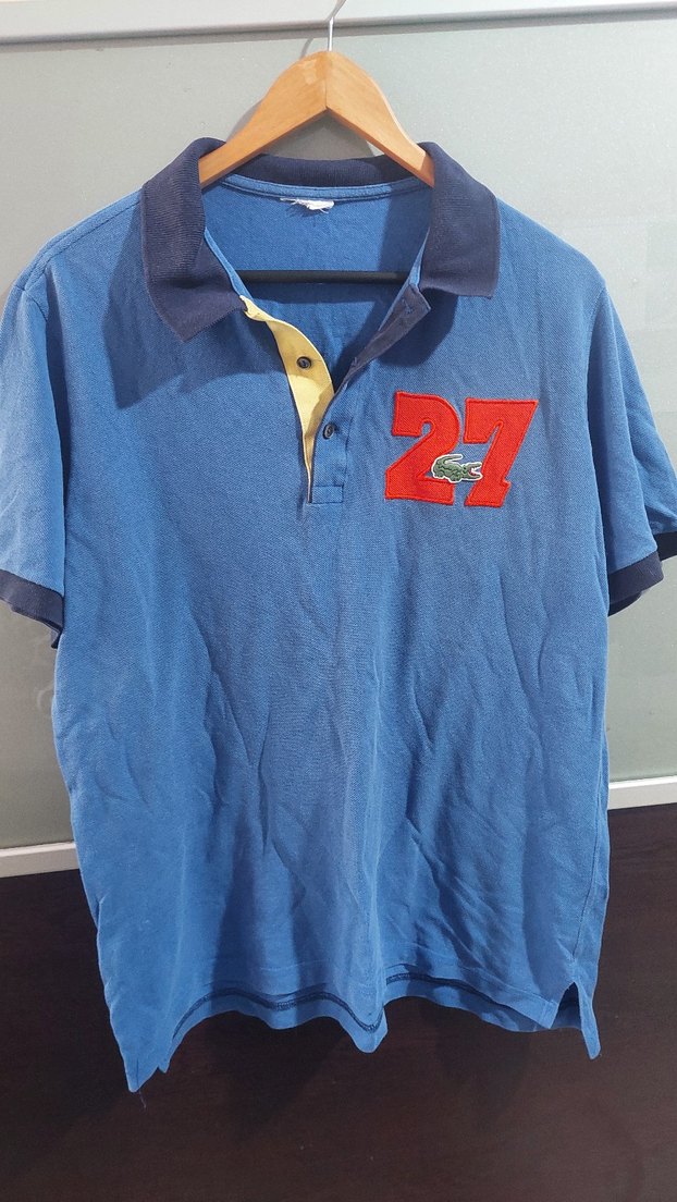 Erkekler için loose fit, kısa kollu, yakalı denim polo tişört. Koyu mavi renkte, göğüste "27" baskısı ve düğmeli. Günlük sokak stili için uygun.