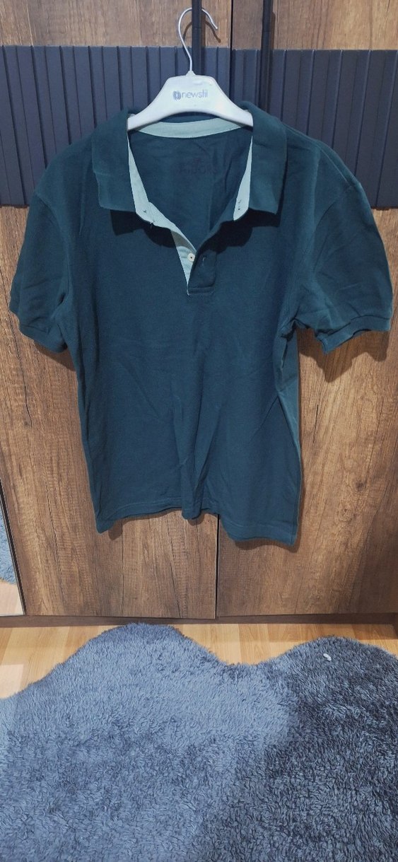 Koyu mavi denim kumaştan, kısa kollu, yakalı ve düğmeli erkek polo tişört. Rahat kesim ve normal boyda, günlük sokak stiline uygun.