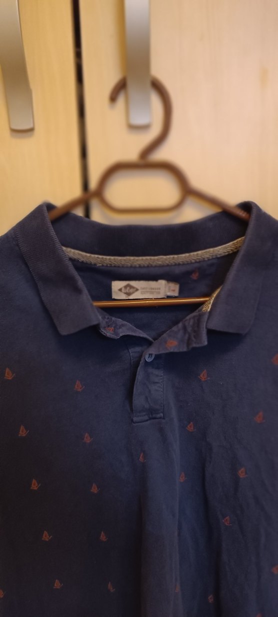 Düğmeli yakalı, kısa kollu erkek lacivert denim polo tişört, bol kesim ve baskılı detaylara sahiptir. Rahat sokak stili için uygundur.