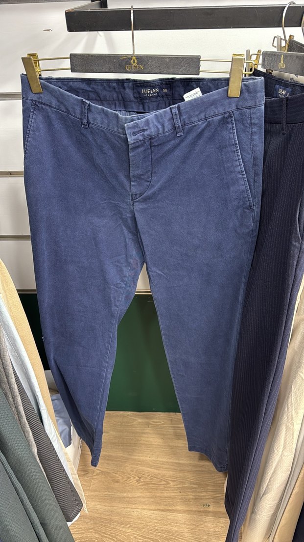 Lacivert denim erkek pantolon, regular fit ve düğmeli. Günlük ve ofis kullanımı için uygun, normal boyda ve deseniz.