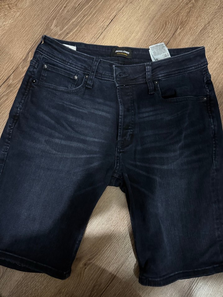 Jack jones Lacivert renkli, düğmeli, regular fit denim şort. Günlük kullanım ve sokak stili için uygun, midi uzunlukta ve desensizdir.