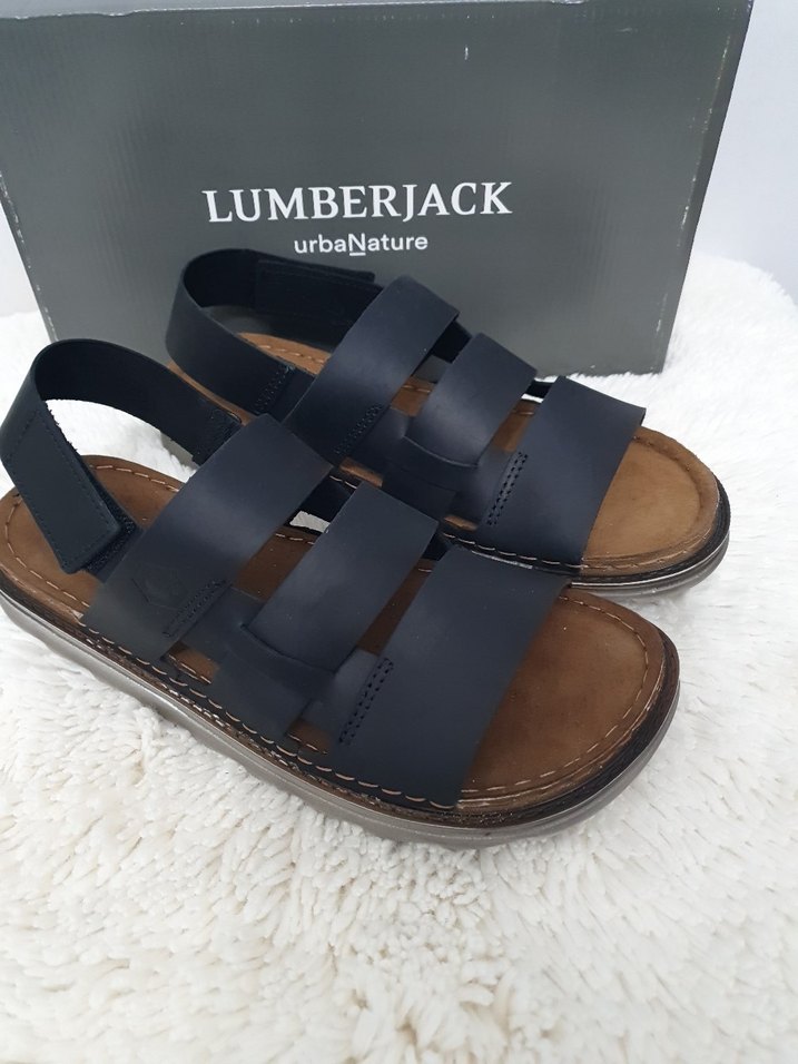 Lumberjack markalı erkek sandalet, lacivert deri kayışları ve tokalı tasarımı ile rahat kauçuk tabana sahiptir.