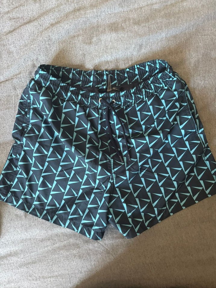 Erkekler için lacivert geometrik desenli, lastikli bel mayo şortu. Konforlu ve yüzmeye uygun.