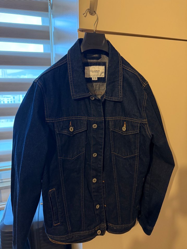 Lacivert düğmeli denim ceket, uzun kollu ve kesik yakalı. Normal kesim ve günlük sokak stili için uygundur.