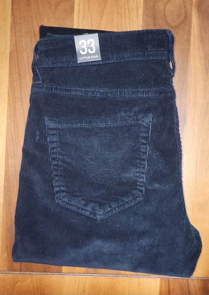 Düğmeli, lacivert renkli, dar kesim erkek kadife pantolon. Normal boy, gündelik ve sokak stili için uygundur.