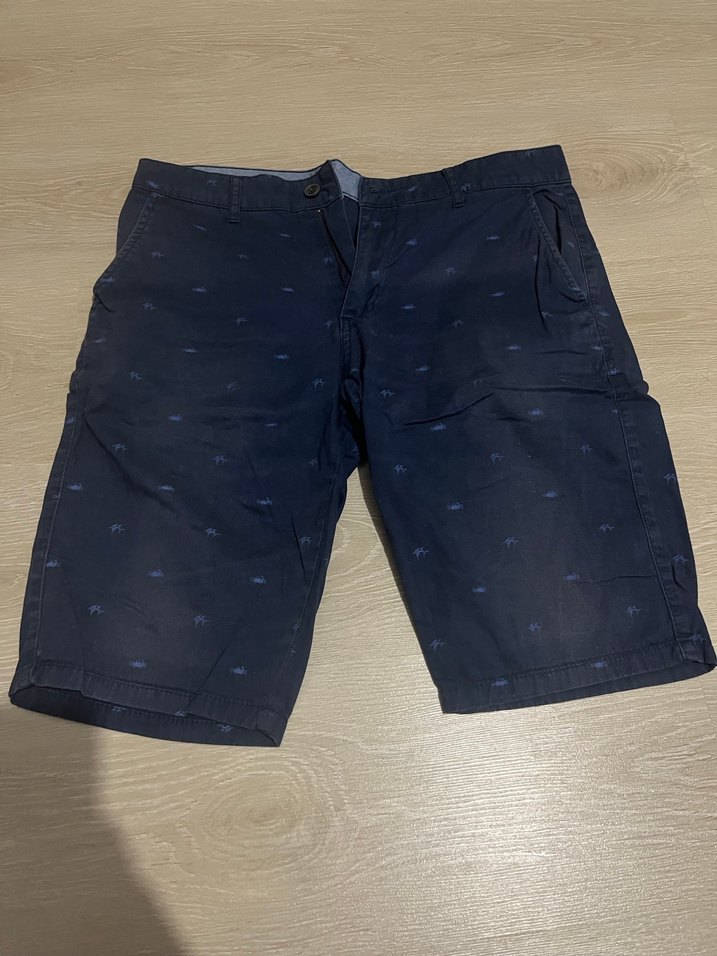 Lacivert renkli, düğmeli, dar kesim erkek kot şort. Günlük rahat ve sokak stiline uygun. Fotoğraflarda görüldüğü gibi