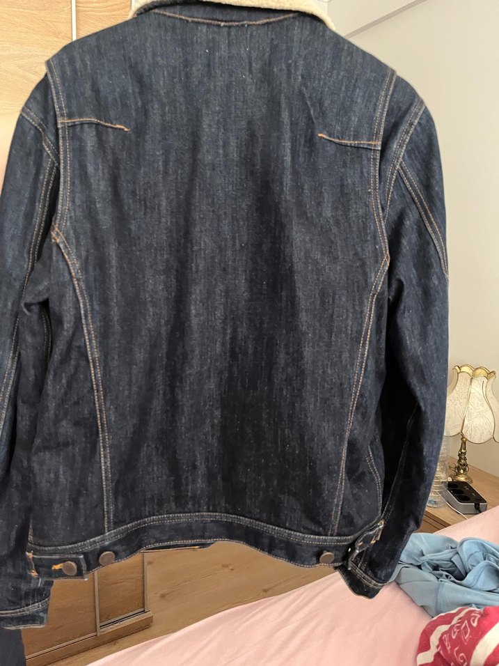Erkekler için lacivert renkli, düğmeli, normal boyda, uzun kollu, fitted kesim denim ceket. Notched lapel yaka ile günlük ve sokak stiline uygun.Deformesi yok çok iyi durumda.