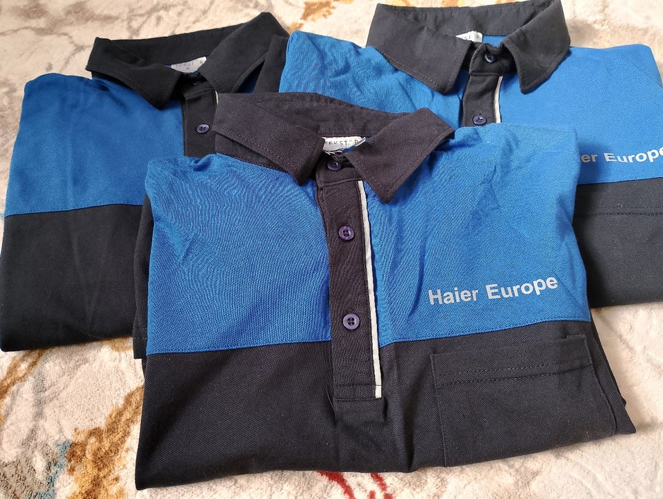 Düğmeli, yakalı erkek polo tişörtü. Sentetik kumaştan, kısa kollu, normal kesim. Lacivert ve baskılı, Haier El yazılı. Günlük ve sokak stili için uygun. m beden iş kıyafeti