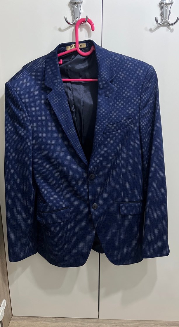 Erkekler için lacivert düğmeli takım ceketi, normal boyda ve uzun kolludur. İş ve günlük sokak stiline uygun, düzenli kesim ve kesik yakaya sahiptir.