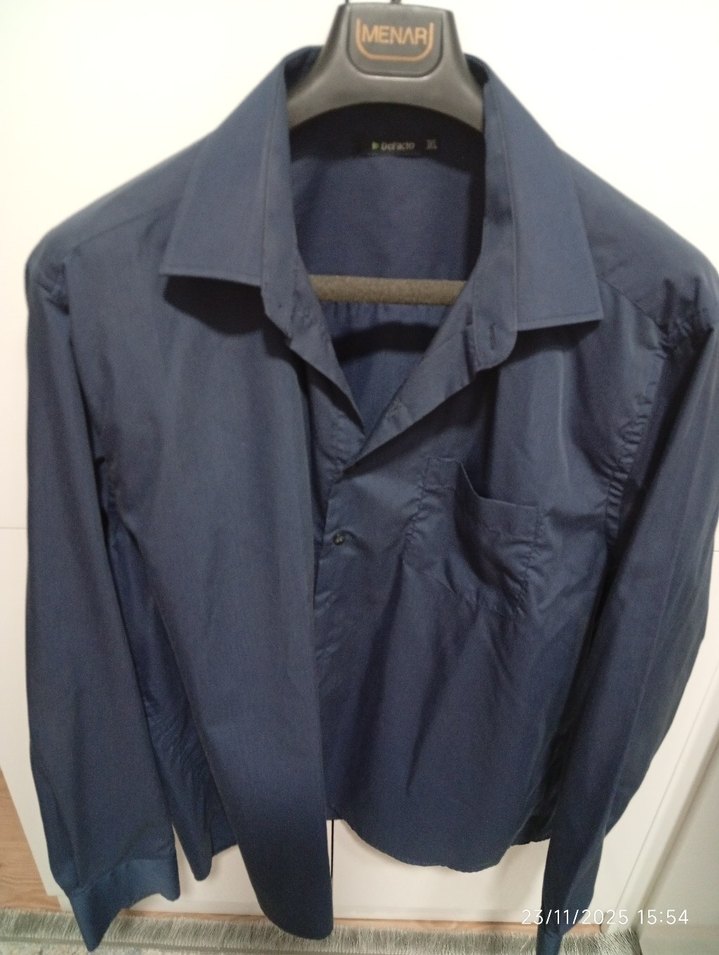 Lacivert renkli, düğmeli erkek gömleği, yakası çentikli ve uzun kolludur. pamuklu kumaştan yapılmış, normal boyda ve rahat kesimlidir. ölçüler göğüs 65,boy 75 cm