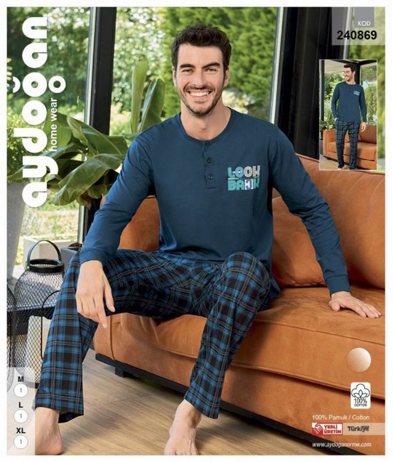 sadece mideum bedenleri vardir AYDOĞAN 240869 ERKEK SÜPREM PATLI U.KOL PJ TKM Erkekler için lacivert düğmeli uzun kollu üst ve baskılı ekoseli midi boy pantolonlardan oluşan rahat kesim pijama takımı. Yumuşak pamuk kumaşlı.