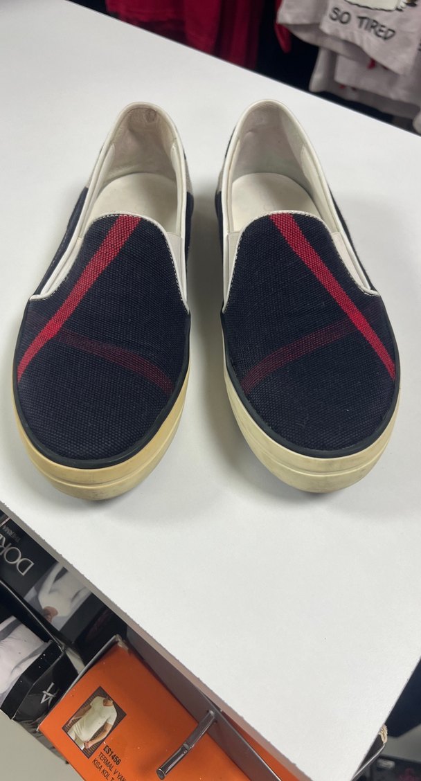 Erkekler için lacivert ekoseli kaydırma ayakkabılar, kauçuk taban ve cırt cırtlı kapanışa sahip, günlük rahat kullanım için uygun. Ürün orjinaldir temizdir