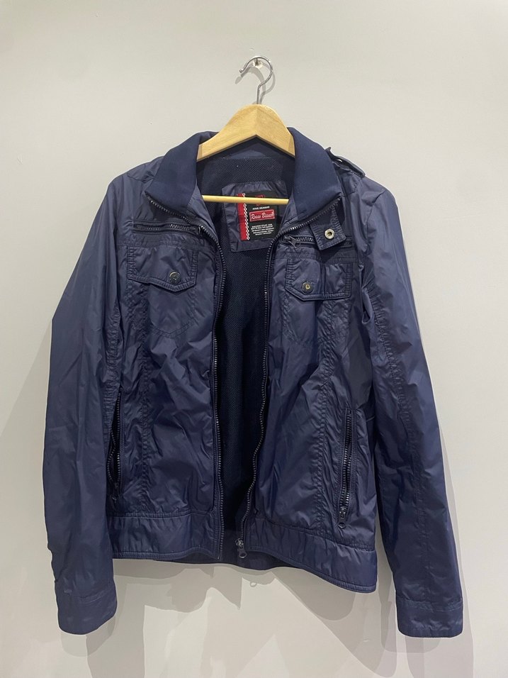 Bu erkek fermuarlı ceket, lacivert renkte, kırmalı yakalı ve dar kesimdir. Sentetik kumaştan üretilmiş, uzun kollu ve normal midi boydadır. Açık hava kullanımı için uygundur.