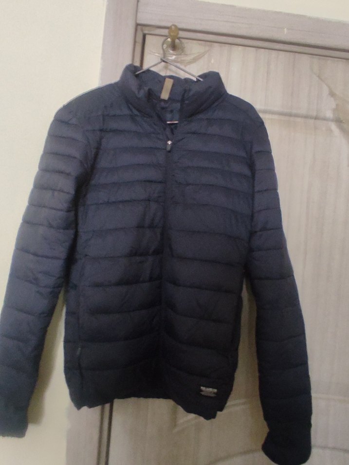 Erkek lacivert mont, yüksek yakalı ve uzun kolludur. Yumuşak kumaştan, fermuarlı ve normal boyda, günlük rahat kullanım için uygundur.