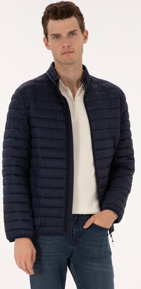 Erkekler için yüksek yakalı, uzun kollu ve vücuda oturan kesimde lacivert ince mont. Sentetik kumaştan, fermuarlı ön ve ceplere sahiptir, günlük kullanıma uygundur.Bir kez 2 saat giyildi