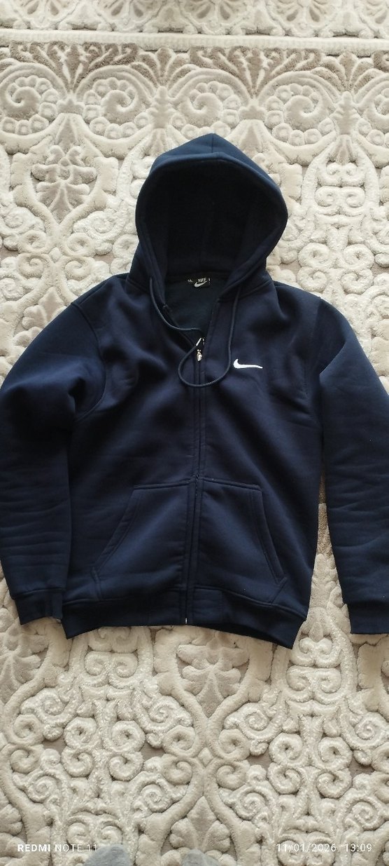 Bu erkek kapüşonlu sweatshirt, fermuarlı ön kısmı ve uzun kollu tasarımıyla lacivert renktedir. Yumuşak ve sıcak kumaştan yapılmış, günlük kullanıma uygun rahat ve şık bir modeldir. Önde cep ve küçük beyaz Nike logosu bulunur.