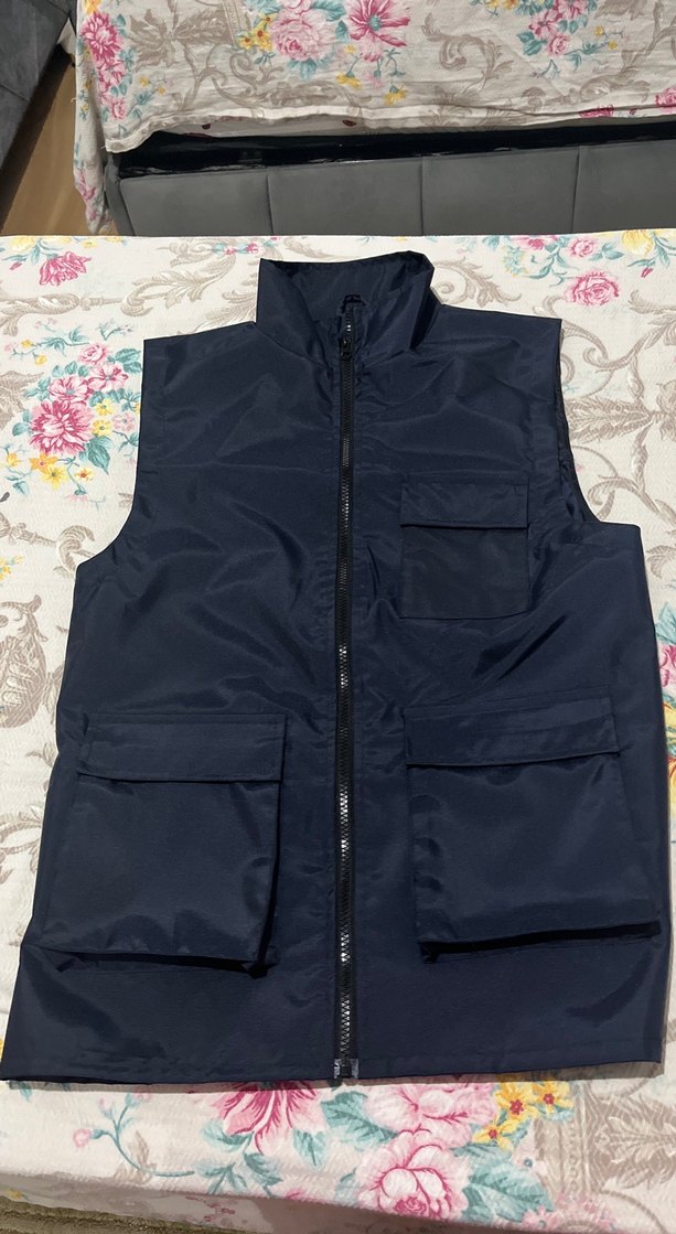 Erkekler için lacivert kolsuz sokak yeleği, fermuarlı ve yakalıdır. Sentetik kumaştan yapılmış, günlük kullanıma uygun, dar kesim ve çoklu ceplere sahiptir.