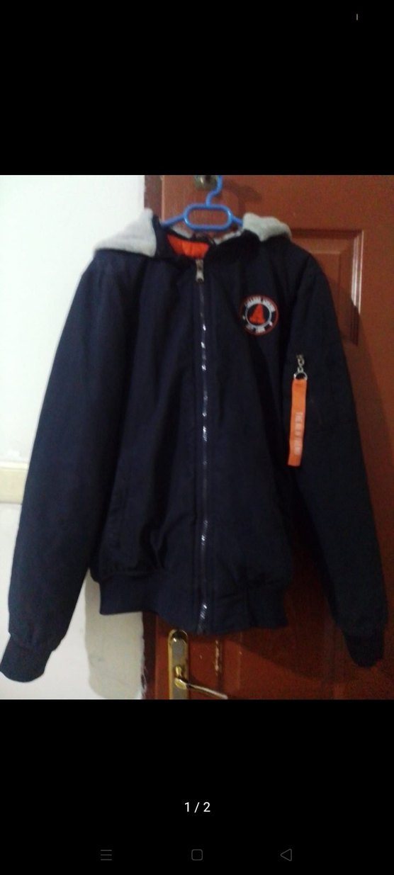 Fermuarlı, kapşonlu, baskılı lacivert erkek mont