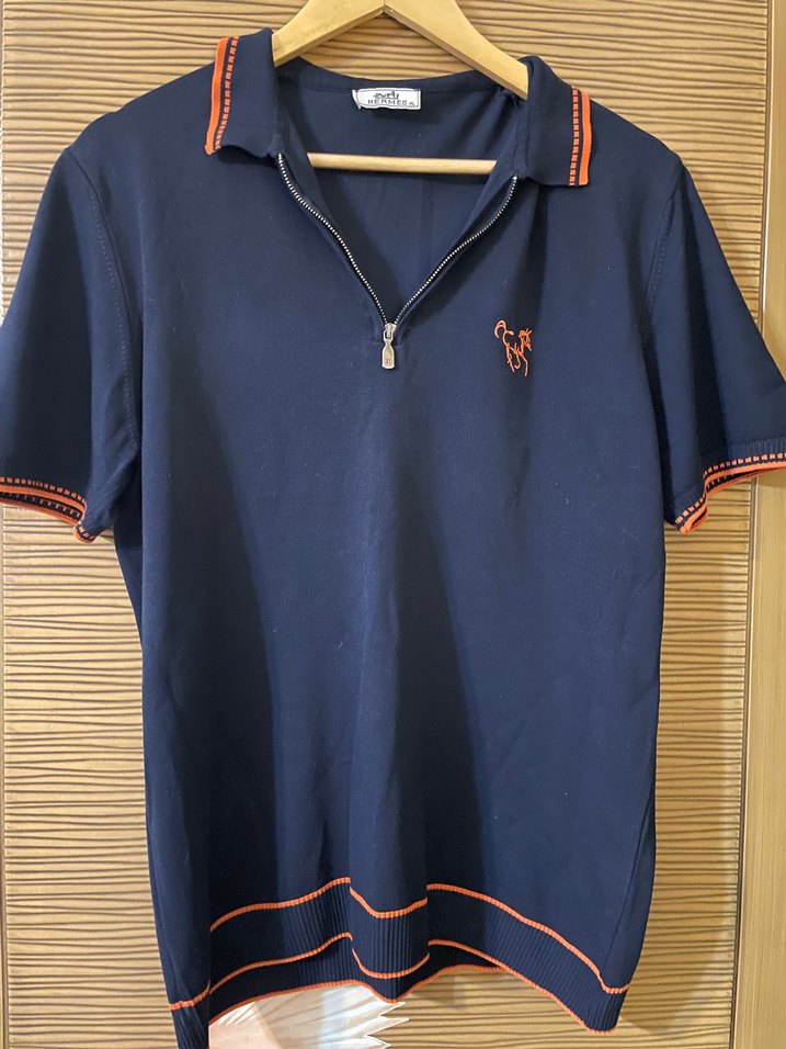 Erkek lacivert polo tişört, fermuarlı yakaya ve kısa kollara sahiptir. Triko
