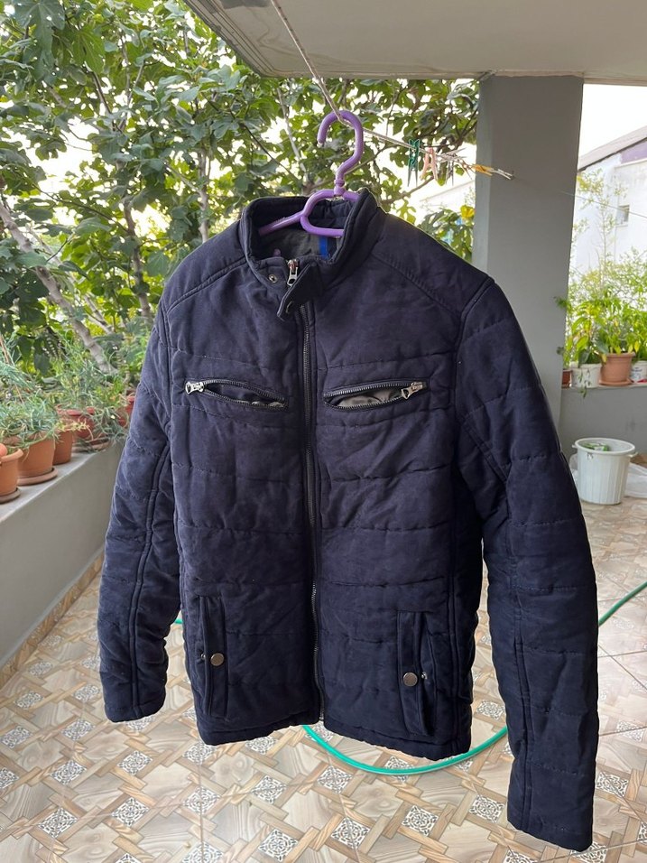 Erkekler için fermuarlı cepli, yakası kesik ve uzun kollu lacivert ceket. Yumuşak ve sıcak kumaştan, normal midi boyda, outdoor için uygun.