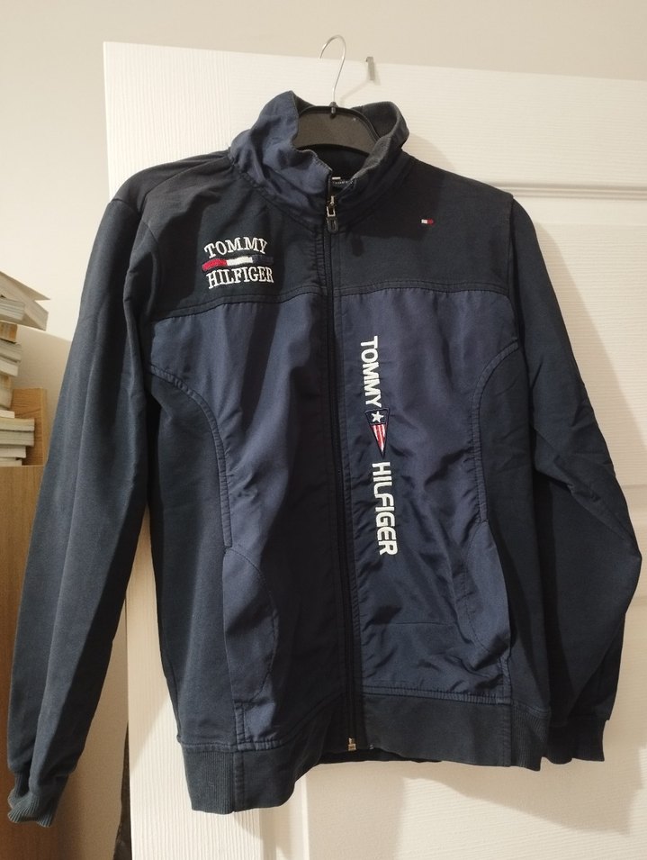Koyu mavi, fermuarlı ve yüksek yakalı erkek çocuk ceketi. Tommy Hilfiger baskılı, yumuşak ve sıcak kumaştan üretilmiştir.