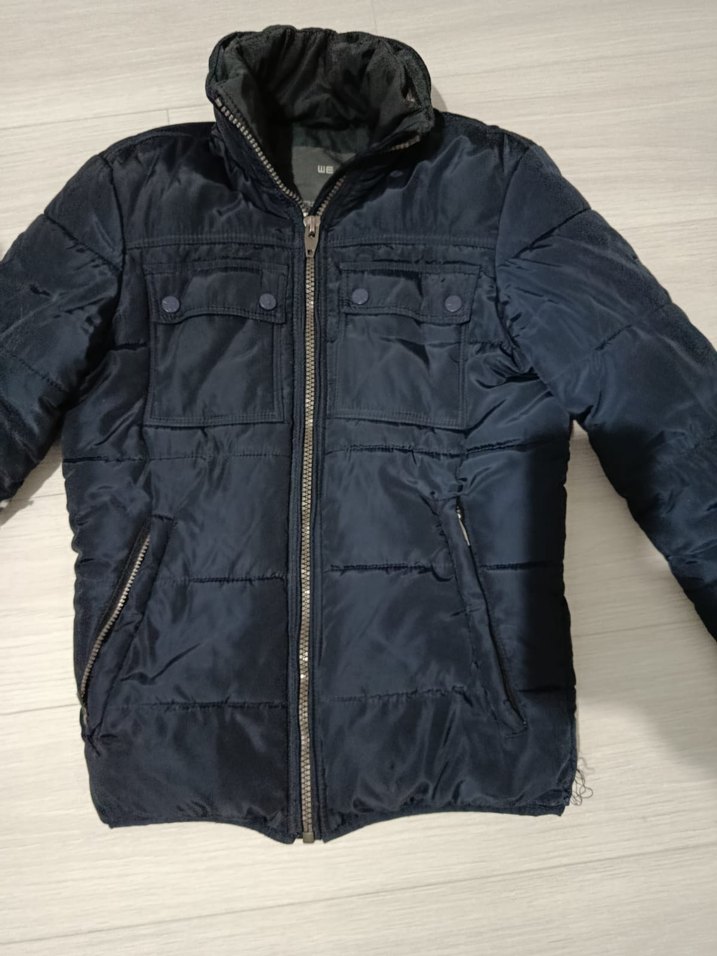 Erkekler için fermuarlı, normal uzunlukta, kesimli lacivert mont. Yumuşak ve sıcak kumaştan, uzun kollu, dış mekan kullanımı için uygun.