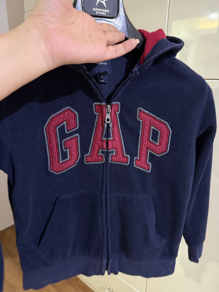 Uzun kollu, fermuarlı, lacivert erkek sweatshirt. Yumuşak ve sıcak kumaştan, baskılı GAP logosu bulunur. Trendy günlük stil için uygun.