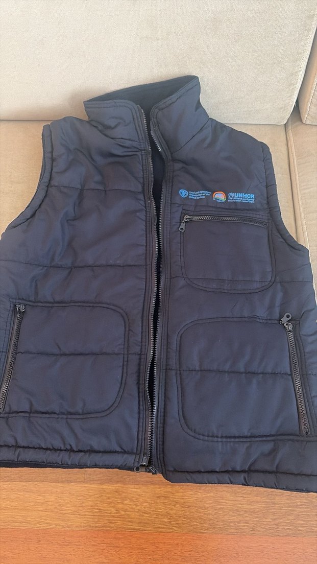 Bu erkek lacivert yelek, fermuarlı ve yüksek yakalıdır. Yumuşak ve sıcak kumaştan yapılmış, günlük rahat kullanım için uygundur. Birleşmiş Milletler ürünü, içi polar.