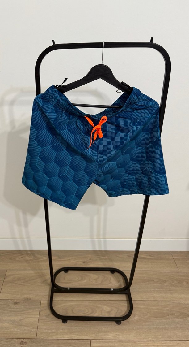 Erkekler için bol kesim, koyu mavi geometrik desenli ve turuncu bağcıklı şort, sportif ve sokak tarzına uygun. Beden m
