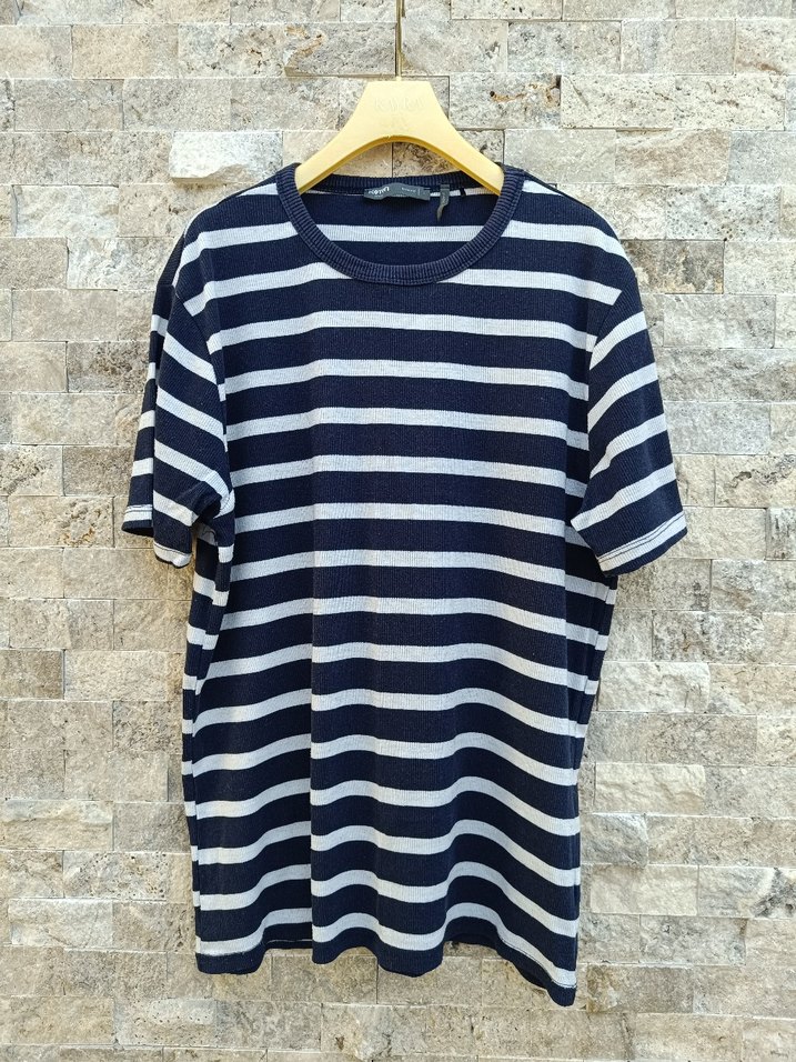 Erkek tişört, kısa kollu ve yuvarlak yakalıdır. Lacivert ve gri çizgili, sentetik kumaştan, rahat kesim ve günlük kullanım için uygundur.