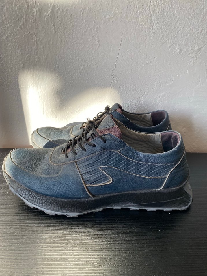Erkekler için lacivert, gri tabanlı, kemerli tasarımlı, kauçuk malzemeden günlük sokak stili spor ayakkabı. Rahat ve şık.