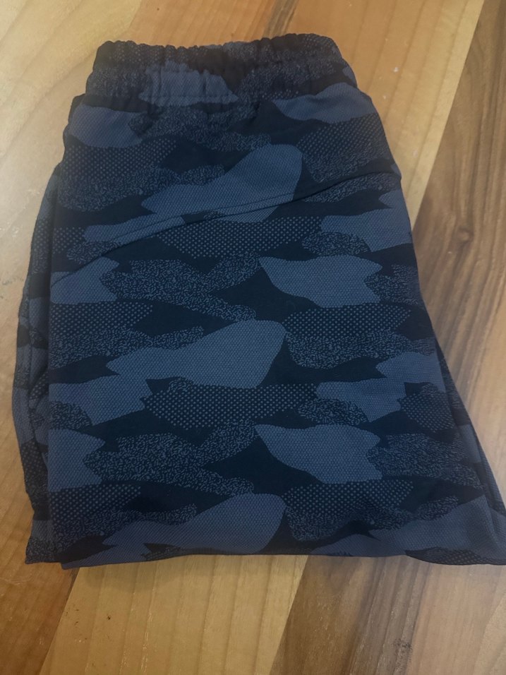 Erkek pijama, koyu mavi kamuflaj desenli, kapüşonlu ve kısa kolludur. Fitted kesim ve pile detaylarıyla uzun boyda, street wear ve athleisure tarzını yansıtır.