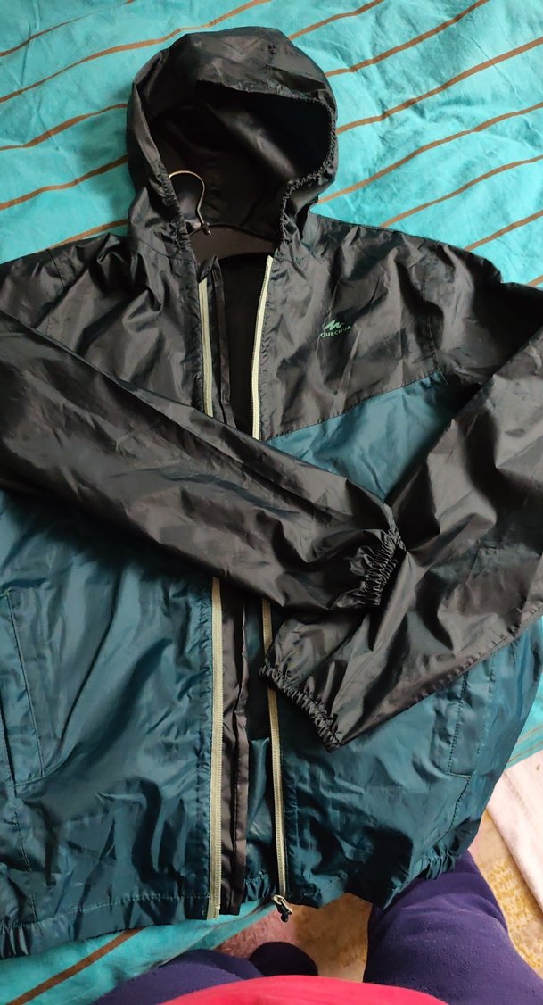 Erkekler için lacivert renkli, kapüşonlu, fermuarlı ve bol kesim sentetik kumaştan yapılmış rüzgarlık ceket. Dış mekan kullanımı için uygundur.
