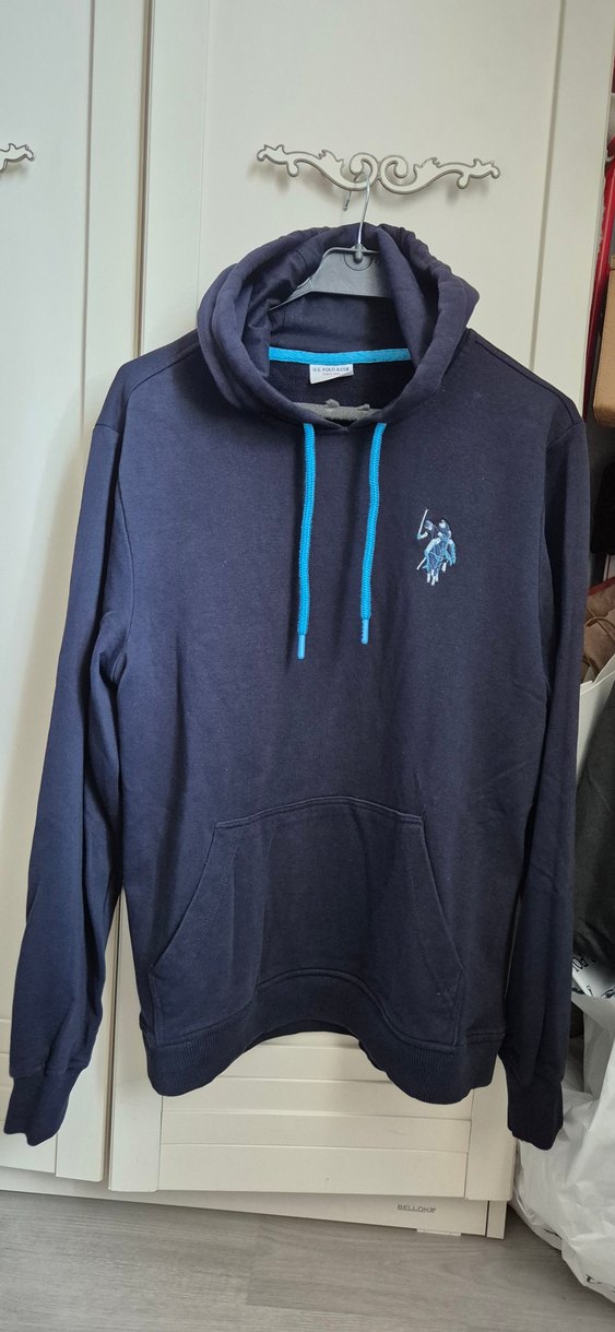 Erkek lacivert kapüşonlu sweatshirt, uzun kollu ve bol kesimdir. Önünde baskılı logo ve kanguru cepli, yumuşak ve sıcak kumaştan üretilmiştir.