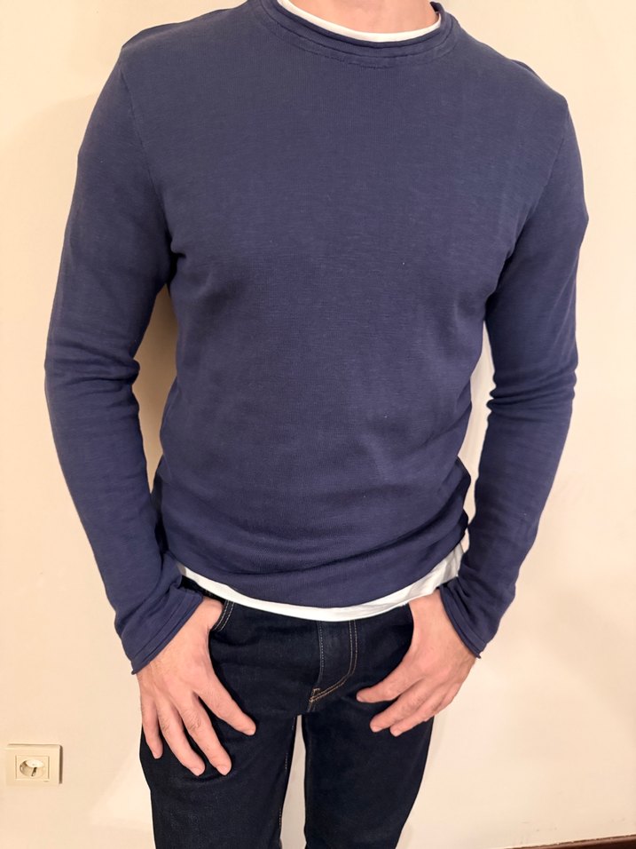 Bu erkek kazak lacivert yumuşak bisiklet yaka ve uzun kollu, dar kesimdir. Günlük kullanıma uygun, rahat ve şık bir normcore tarzdadır.