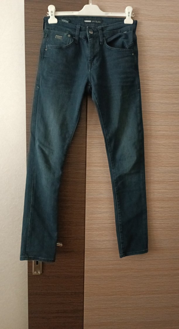 Erkekler için kemerli, regular fit kesime sahip lacivert kot pantolon. Dayanıklı denim kumaştan, günlük kullanıma uygun midi boyda.