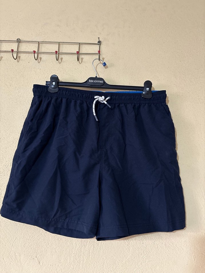 Erkekler için kemerli, koyu lacivert renkte, bol kesim şort. Plaj ve sokak tarzına uygun, desensiz ve sade tasarım. George marka