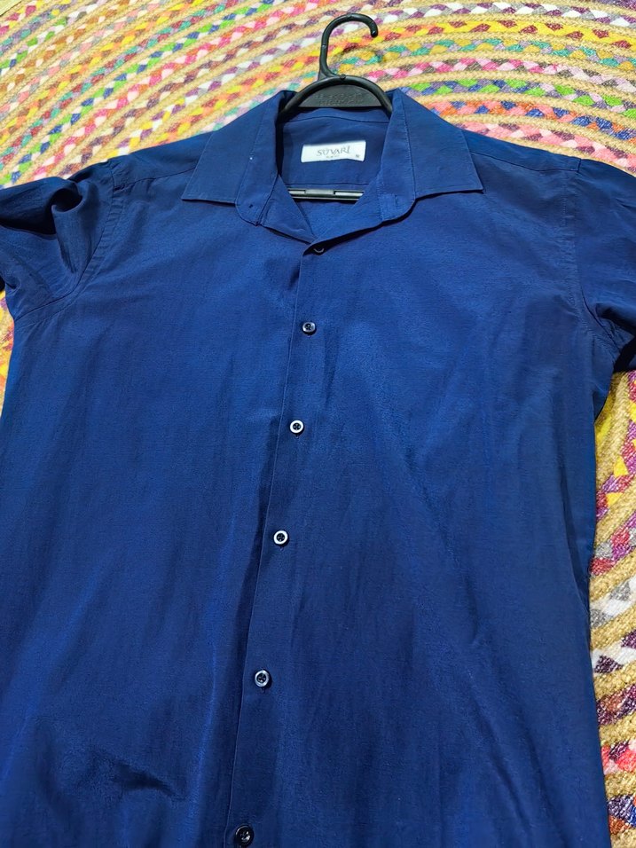 Lacivert renkli, kısa kollu, düğmeli ve yakalı erkek gömleği. İnce ve ipeksi kumaştan, normal kesim ve midi boyda, ofis kullanımına uygun.