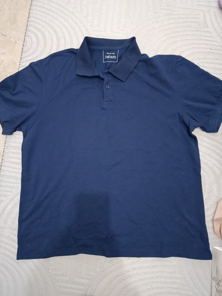 Erkekler için yakalı, kısa kollu ve düz lacivert renkte, rahat sentetik kumaştan yapılmış günlük kullanıma uygun polo tişört. DeFacto marka hiç kullanılmamıştır içindeki etiketi de mevcuttur Temiz sıfır defosuz.Bedeni xl yazıyor ama XXL bedene uyar