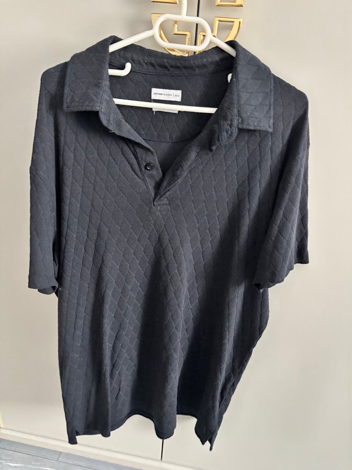 Lacivert renkte, keten kumaştan yapılmış erkek kısa kollu polo tişört. Düğmeli ve yaka detaylı, rahat kesim ve normal boyda, günlük sokak stili için uygun.