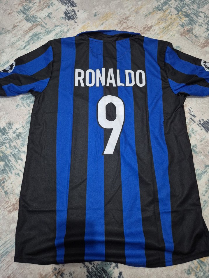 Lacivert kısa kollu erkek forma, baskılı dikey çizgiler ve sırtında 'RONALDO 9' yazısı. Sentetik kumaştan, yuvarlak yakalı ve bol kesim, spor ve günlük kullanım için uygundur. inter forma