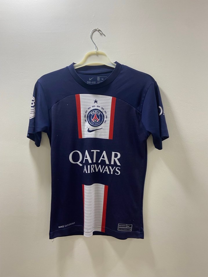 Erkekler için lacivert kısa kollu, bisiklet yaka, baskılı spor forması. Qatar Airways logosu ve velcro detayı bulunur. Spor ve sokak giyimine uygun. ⚽